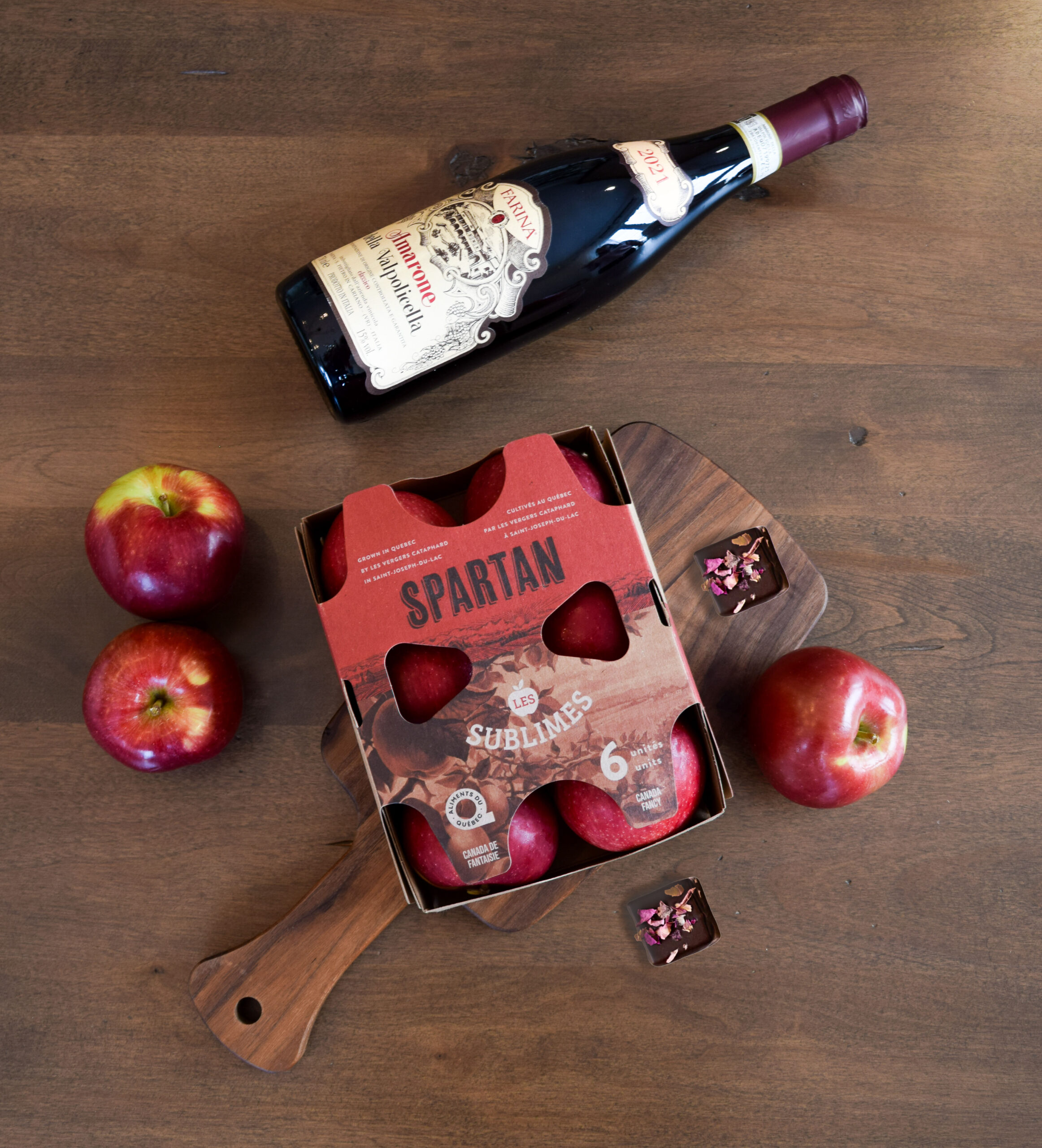 Un Amarone structuré et expressif vient enrichir l’accord avec ses arômes de cerise noire, de figue séchée et de cacao amer. Sa texture ample et sa finale chaleureuse prolongent les notes du chocolat tout en contrastant avec la vivacité de la pomme, pour une expérience audacieuse et harmonieuse.