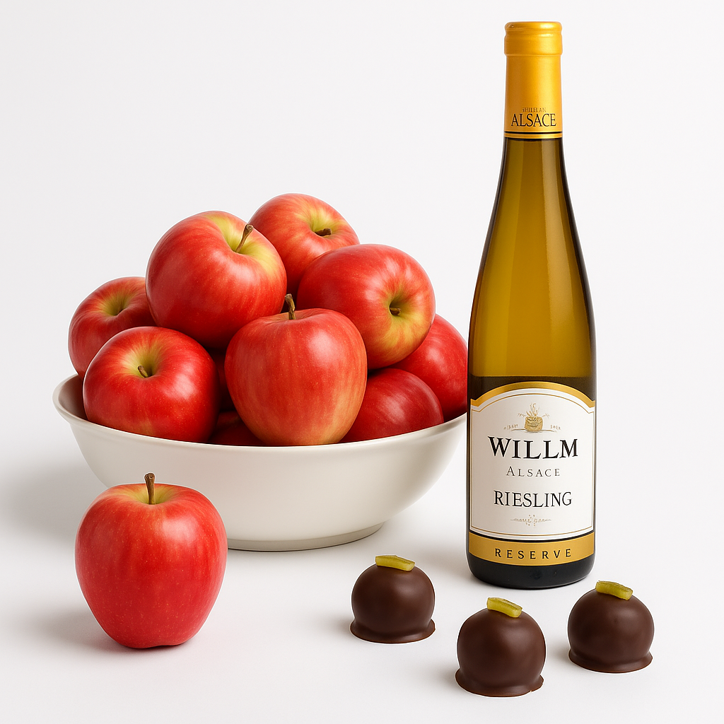 Un vin blanc sec et fruité, comme un Chenin blanc ou un mousseux brut, vient compléter l’accord avec ses notes florales et sa vivacité, prolongeant la fraîcheur de la pomme tout en équilibrant la douceur du chocolat.