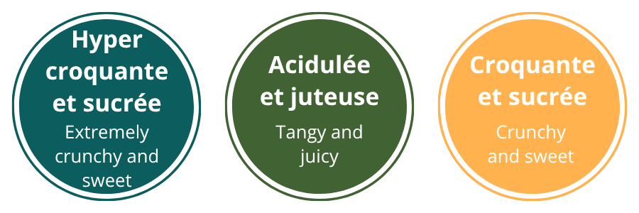 Croquante • Sucrée • Juteuse • Peu acide • Aromatique